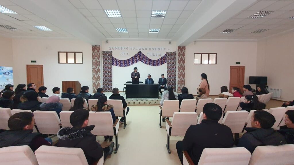The rector of TSUOS Rikhsieva Gulchehra Shavkatovna at the meeting with students of the 1-2 courses of the Urgench College of Oriental Languages and Service.