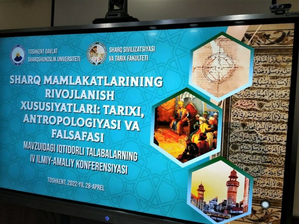 On April 28, 2022, the Faculty of Oriental Civilization and History of Tashkent State University of Oriental Studies organized the IV scientific-practical conference of talented students on “Development features of the East: history, anthropology and philosophy.” The conference was attended by many undergraduate and graduate students of the university with their research papers. 75 articles were published as a result of the conference. culture ”were selected. About 10 selected papers were heard and discussed at the plenary session of the conference. After the plenary session, the speakers continued their speeches in 4 sections, and at the end of the conference, the views of teachers and students were heard. The opinions expressed were discussed and certificates were awarded to the students who participated with their scientific articles.