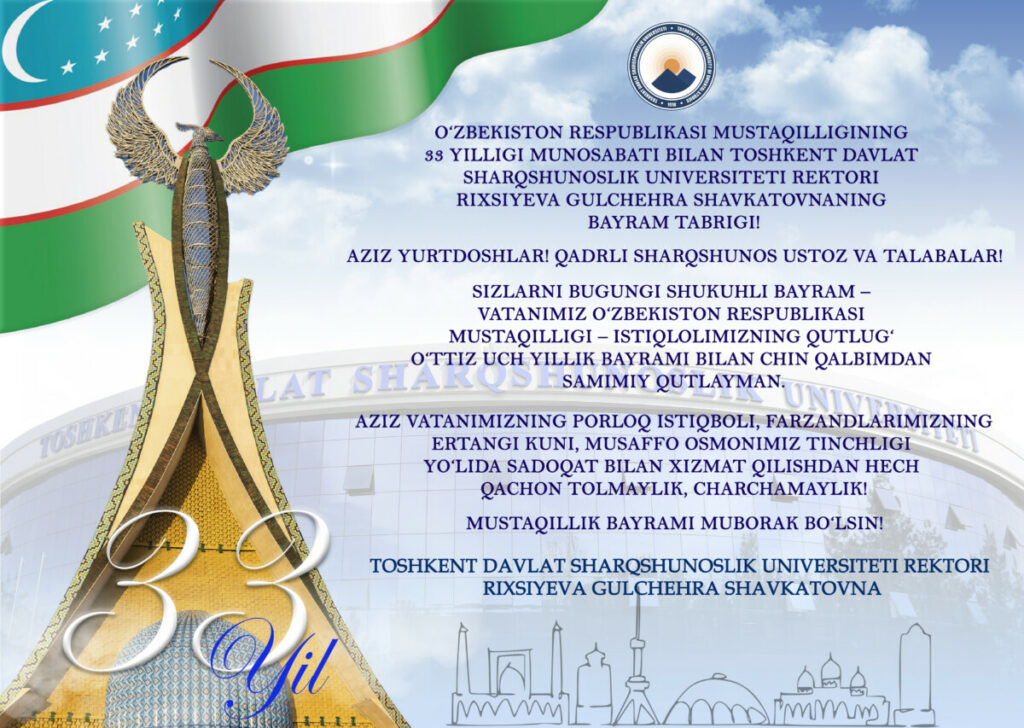 (Uzbek) Toshkent davlat sharqshunoslik universiteti rektorining Mustaqilligimizning 33 yilligi munosabati bilan jamoaga yo‘llagan bayram tabrigi