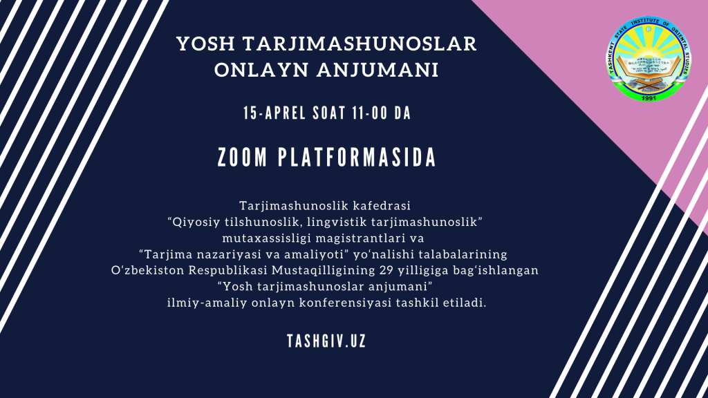 The annual traditional scientific-practical conference of masters of “Comparative Linguistics, Linguistic Translation” and students of “Theory and Practice of Translation” dedicated to the 29th anniversary of Independence of the Republic of Uzbekistan,the main conference is held remotely.