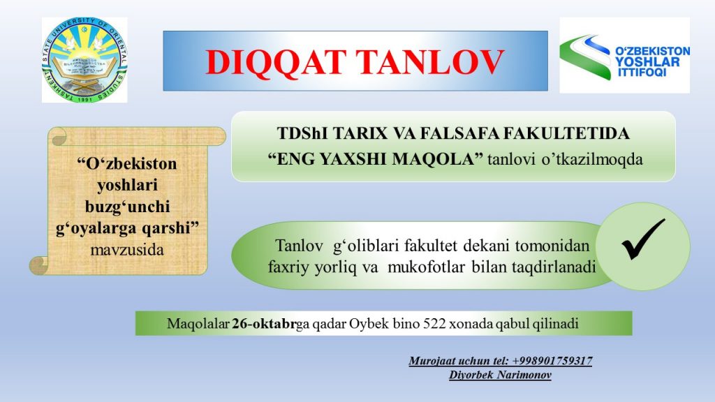 Maqolalar 26-oktabrga qadar Oybek bino 522-xonada qabul qilinadi.