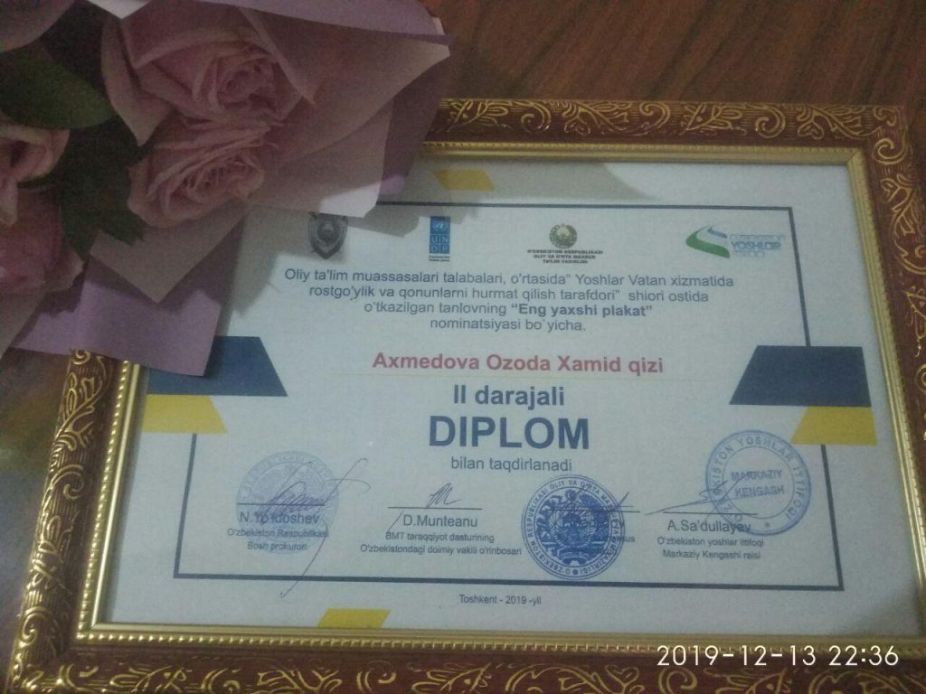 ToshDSHI Sharq filologiyasi fakulteti Tarjimashunoslik kafedrasi 1-kurs talabasi Axmedova Ozoda Hamid qizi Respublika oliy ta’lim muassasalari talabalari o’rtasida «Yoshlar Vatan xizmatida, rostgo’ylik va qonunlarni hurmat qilish tarafdori» shiori ostida o’tkazilgan tanlovning «Eng yaxshi plakat» nominatsiyasi bo’yicha sovrinli 2-o‘rin sohibasi bo‘ldi.
