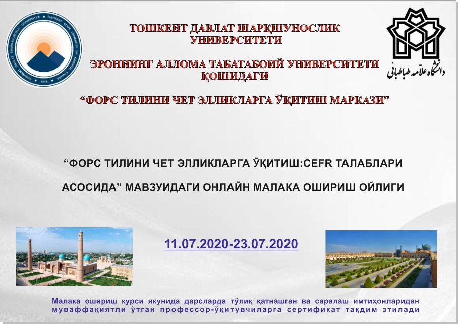 Bugun, 11-iyul sanasidan boshlab, “Eron-afg‘on filologiyasi” va «Mumtoz filologiya va adabiy manbashunoslik» kafedralari professor-o‘qituvchilari uchun Eronning “Alloma Tabotaboiy” universiteti tomonidan “Fors tilini chet elliklarga o‘qitish: CEFR talablari asosida” mavzuida malaka oshirish oyligi boshlandi.