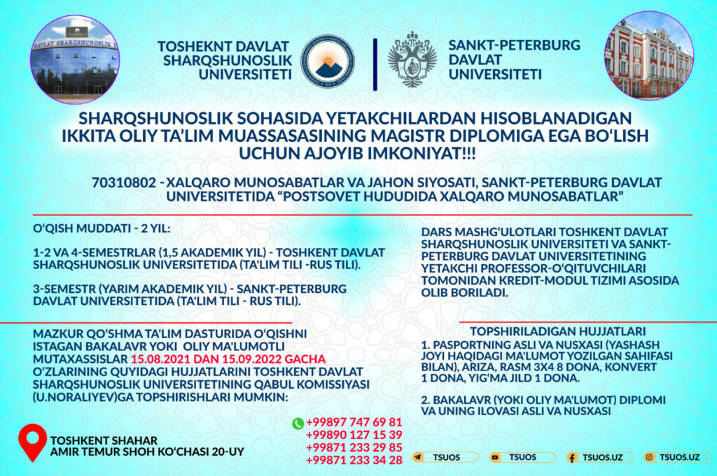 Toshkent davlat sharqshunoslik universiteti Rossiya Federatsiyasining Sankt-Peterburg davlat universiteti bilan hamkorlikdagi magistratura qo‘shma ta’lim dasturida o‘qishga taklif etadi.