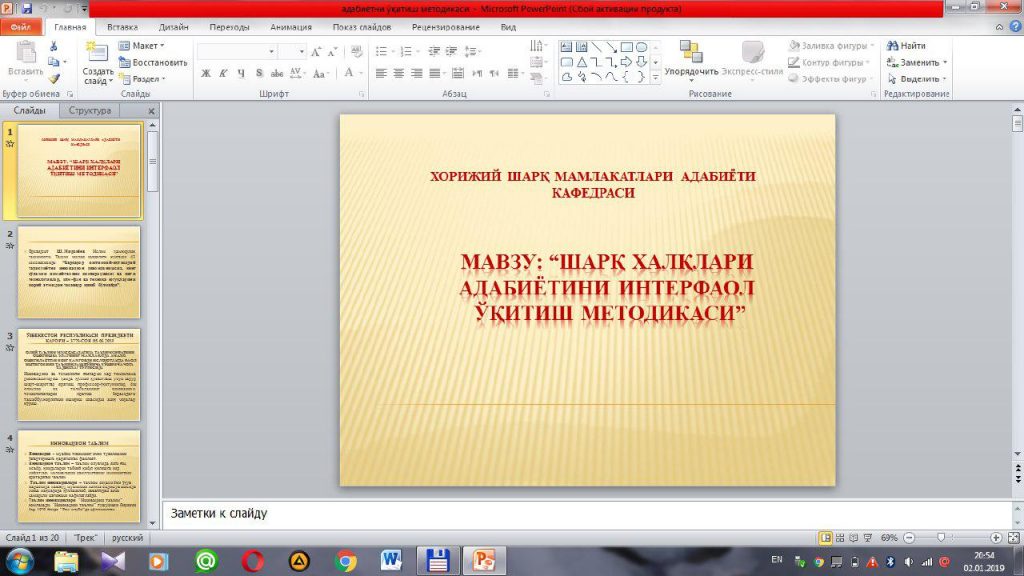 2018-yil 27-dekabr kuni Toshkent davlat sharqshunoslik instituti Ilmiy Kengashida “Xorijiy Sharq mamlakatlari adabiyoti” kafedrasi professor-o‘qituvchilari tomonidan “Innovasion hamkorlik va interaktiv o‘qitish jarayoni” bo‘yicha tayyorlangan slayd–prezentasiyani kafedra mudiri fil.f.d., D.Z.Muhiddinova tomonidan taqdim etildi. Mazkur taqdimot Kengash a’zolari tomonidan yuqori baholandi va e’tirofga sazovor bo‘ldi.