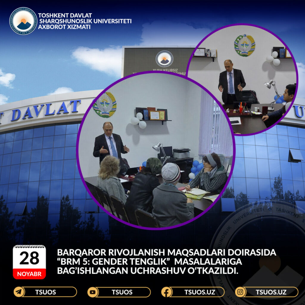 2022- yil 28- Noyabr kuni TDSHU Xitoyshunoslik fakulteti dekani K.U.Imamnazarov Toshkent shahri Uchtepa tumani Vatanparvar mahallasida BMTning 17 ta Barqaror rivojlanish maqsadlari doirasida “BRM 5: Gender tenglik” masalalariga bag’ishlangan ma’ruza o‘qidi.