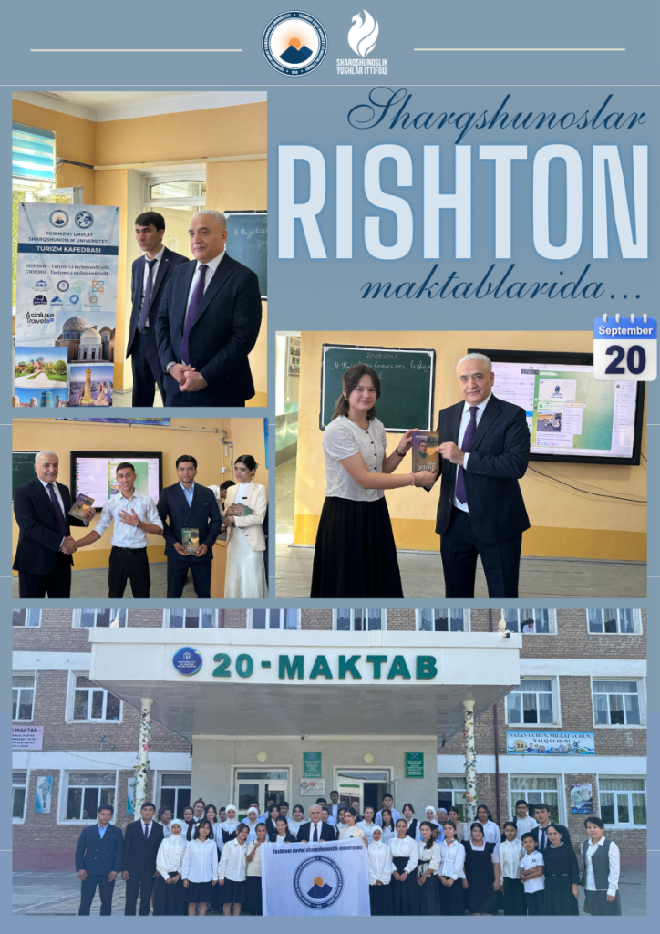 Toshkent davlat sharqshunoslik unversiteti ishchi guruhi tomonidan 2025-yil 20-sentabr Rishton tumanidagi 20-umumiy o‘rta ta’lim maktabida turizm sohasini keng targ‘ib etish, yosh avlodni milliy qadriyatlar va hududning sayyohlik salohiyati bilan yaqindan tanishtirish maqsadida davra suhbati va viktorina tashkil etildi.