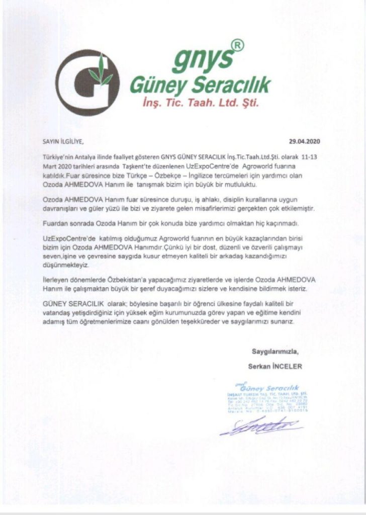 Bugun ToshDShU rahbariyati nomiga Turkiyaning «Gnys Güney Seracılık» Kompaniyasidan rasmiy xat keldi. Unda yozilishicha Sharq filologiyasi fakulteti «Tarjima nazariyasi va amaliyoti» yo‘nalishi 1-kurs talabasi Ahmedova Ozodaning Toshkent shahrida 11-13 mart kunlari UzExpoCentre markazida bo‘lib o‘tgan Xalqaro ko‘rgazmada Turkcha-o‘zbekcha-inglizcha tarjimoni sifatida alohida xizmat ko‘rsatgani ta’kidlanib universitet rahbariyatiga minnatdorchilik bildirilgan va bunday talabalarni tayyorlayotgan universitet professsor-o‘qituvchilariga alohida tashakkur va ehtirom izhor etilgan.
