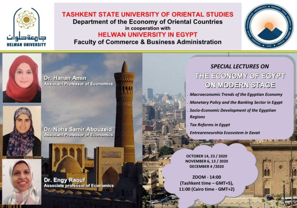 ⚡️⚡️Toshkent davlat sharqshunoslik universiteti tomonidan Misr Arab Respublikasining Xelvon universiteti bilan hamkorlikda Zoom platformasi orqali 2020-yilning oktabr-dekabr oylarida “Sharq mamlakatlari iqtisodiyoti” kafedrasi arabshunos talabalari uchun “Misr iqtisodiyoti zamonaviy bosqichda” deb nomlangan onlayn ma’ruzalar turkumini tashkil etish rejalashtirilgan.