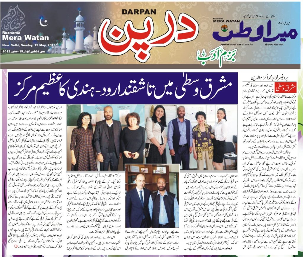 O‘zbekiston Respublikasi Prezidentining “Oliy ta’lim tizimini yanada rivojlantirish chora-tadbirlari to‘g‘risida”gi PQ-2909-sonli qaroridagi Oliy ta’lim mussasini jahonning yetakchi ilmiy-ta’lim muassalari bilan yaqin hamkorlik aloqalarini o‘rnatish bilan bog‘liq vazifasining ijrosini ta’minlash yo‘lida Toshkent davlat sharqshunoslik instituti jahonning bir qancha yetakchi universitetlaridan mutaxassislarni taklif etib, talabalarning o‘z sohasida sifatli ilm olishlarini ta’minlash ishlariga qo‘l urdi. Bu borada institutning Janubiy va janubi-sharqiy Osiyo tillari kafedrasi ham Hindistonning Javaharlal Neru universiteti urdu tili bilimdoni, jahonning 20dan ortiq mamlakatlarida urdu tilidan saboq berib kelgan professor Xoja Ikramuddinni talabalarga urdu tili va adabiyotidan saboq berish uchun taklif etdi. May oyida tashrif buyurgan professor Xoja Ikramuddin urdu tili va adabiyoti fanlaridan 1, 2 va 3 kurs urdu-ingliz guruxlariga til va adabiyotdan saboq berdi. Professor Xoja Ikramuddin Toshkent davlat sharqshunoslik institutiga tashrif buyurish oldida darslarga tayyorgarlik ko‘rib, urdu tili grammatikasiga oid jami 80 ta slayd-taqdimot, urdu adabiyoti fanidan bir qancha slaydlar, taniqli yozuvchilar asari asosida tayyorlangan qisqa metrajli filmlarni talabalarga dars jarayonida ko‘rsatib, mavzu bo‘yicha davra suhbatlari, qiziqarli baxs va munozaralar o‘tkazib talabalarda urdu tili va adabiyotiga bo‘lgan qiziqishining ortib, urdu tilini amaliy qo‘llash bo‘yicha ko‘nikmalarini oshirishga katta hissa qo‘shdi. Professor Xoja Ikramuddinning urdu tili bo‘yicha tayyorlab kelgan slayd-taqdimotlari aniq mavzular doirasida bo‘lib, urdu tilining tovush tizimi uchun alohida, urdu tili grammatik qoidalari uchun alohida, shuningdek, urdu tili stilistikasi uchun alohida slayd-taqdimotlardan tashkil topgan. Ushbu slayd-taqdimotlardan har ikkala guruxda dars jarayonida foydalanish imkoniyati bo‘lishini ta’minlash maqsadida Xoja Ikramuddin ularning ayrimlarini ham urdu, ham hindiy tillarida tayyorlab kelganligi biz uchun juda katta amaliy ahamiyat kasb etmoqda. O‘zbekistonda, Toshkent davlat sharqshunoslik instituti rahbariyati, professor-o‘qituvchilari hamda talabalar bilan yaqin hamkorlikda ishlashdan mamnun bo‘lgan professor Ikramuddin o‘z yurtiga qaytgach Institutimiz, undagi ta’lim tizimi, urdu va hindiy tillarining o‘qitilishi haqidagi o‘z mulohazalarini bir qancha matbuot sahifalarida yoritib bormoqda. Jumladan, may oyining ikkinchi yarmida “Toshkent-Markaziy Osiyoda urdu va hindiyning yirik markazi” nomli maqolasi Dehlida nashr etiladigan “Mera Vatan (Mening vatanim)”, “Uran” (Parvoz), Sachki Avaz (Haqiqat ovozi) gazetalarida, Lakxnau shahrida nashr etiladigan Avadnoma (Avadnoma), Kashmirda nashr etiladigan Lazaval (Boqiy) hamda Germaniyada nashr etiladigan Shane Pakistan (Pokiston shon-shuhrati) kabi gazektalarda chop etildi. Ularda institutimizda urdu va hindiy tillarining o‘qitilishi va institut faoliyati haqida iliq ma’lumotlar, fikr-mulohazalar bayon etilgan. Professor Xoja Ikramuddinning ushbu safari O‘zbekistonni, intitutimizni, bizning ta’lim tizimiz va o‘zbek yoshlarining xayoti, o‘zbek xalqining mehmondo‘stligini jahon miqyosidagi o‘quvchilarga yetkazish ishlariga ijobiy bir hissa bo‘lib qo‘shilmoqda. Ulardan ayrimlarini biz institut saytiga joylashtirishni lozim topdik.