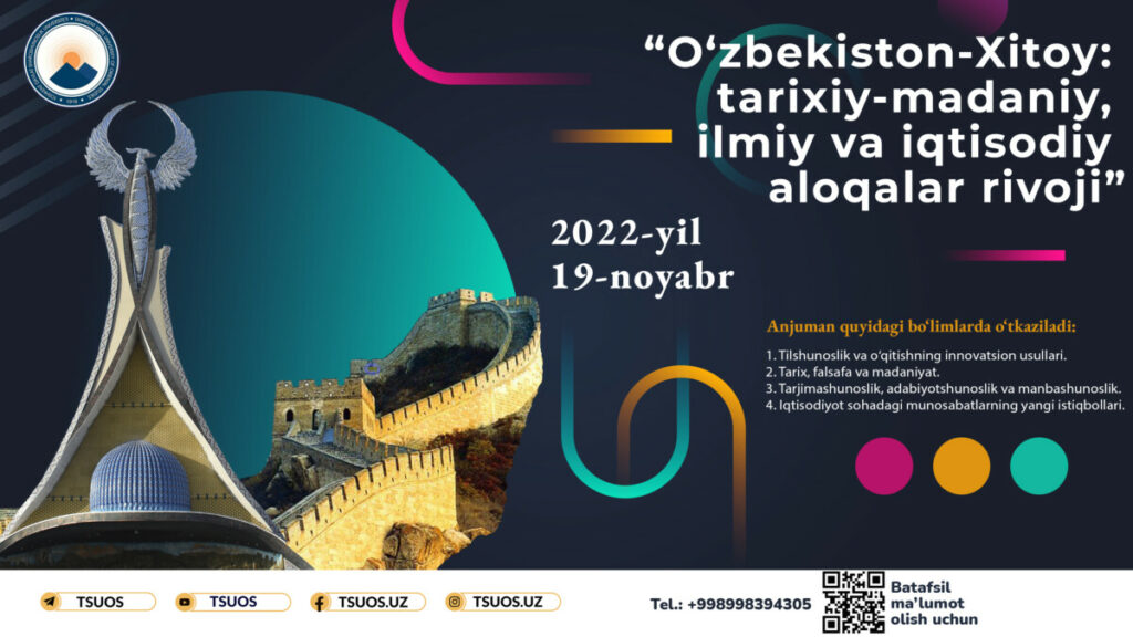 Toshkent davlat sharqshunoslik universitetida 2022-yil 19-noyabr kuni “O‘zbekiston-Xitoy: tarixiy-madaniy, ilmiy va iqtisodiy aloqalar rivoji” mavzusida Xalqaro ilmiy-amaliy konferensiya o‘tkaziladi. Konferensiya offlayn shkalda o‘tkaziladi.