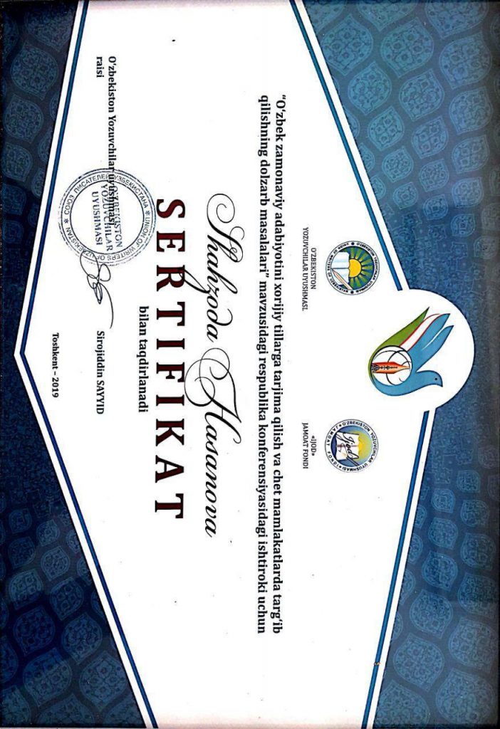 ToshDSHI professor o‘qituvchilaridan bir guruhi, jumladan, f.f.n., dotsent Adhambek Alimbekov, PhD Xayrulla Hamidov, o‘qituvchi Shahzoda Hasanovalar O‘zbekiston Yozuvchilar uyushmasi tomonidan 2019 yil 17-dekabrda tarjimashunoslikning dolzarb muammolariga bag‘ishlab o‘tkazilgan Respublika konferensiyasidaga faol ishtiroklari uchun O‘zbekiston Yozuvchilar uyushmasi va O‘zbekiston Yozuvchilar uyushmasi “Ijod” fondining Sertifikatlari bilan taqdirlandilar.Bundan tashqari, ToshDSHI dotsenti, f.f.n. Adhambek Alimbekov “Navoiy va Bobur asarlarini xorijiy tillarga taglama va badiiy tarjima qilish masalalari” mavzusidagi respublika konferensiyasidagi ishtiroki uchun ham O‘zbekiston Yozuvchilar uyushmasi va O‘zbekiston Yozuvchilar uyushmasi “Ijod” fondining Sertifikati bilan taqdirlandi.