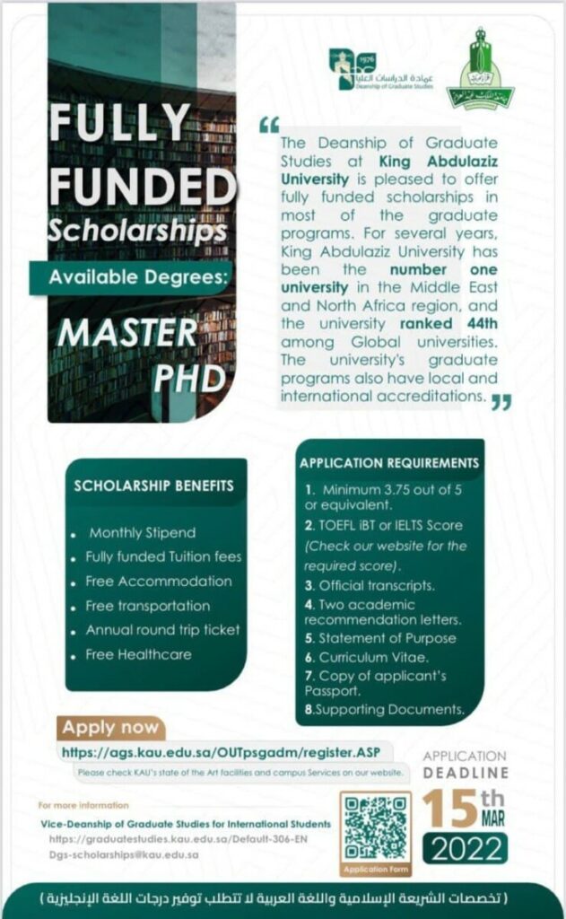 Qirol Abdulaziz universiteti bitiruvchi talabalar uchun to’liq moliyalashtirilgan dastur stipendiyalarini mamnuniyat bilan taklif qiladi
