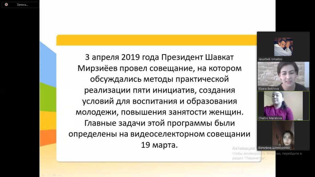 30 апреля в рамках Пяти основных инициатив Президента Республики Узбекистан Шавката Мирзиёева при участии декана Корееведения Ш.Р. Усмановой, заместителя декана Ж.Исмаилова, а также профессоров и преподавателей факультета со студентами 1курса кафедры Корейской филологии посредством программы Zoom была проведена онлайн-конференция, организованная куратором группы преподавателем кафедры Корейской филологии Э.М.Бекировой.