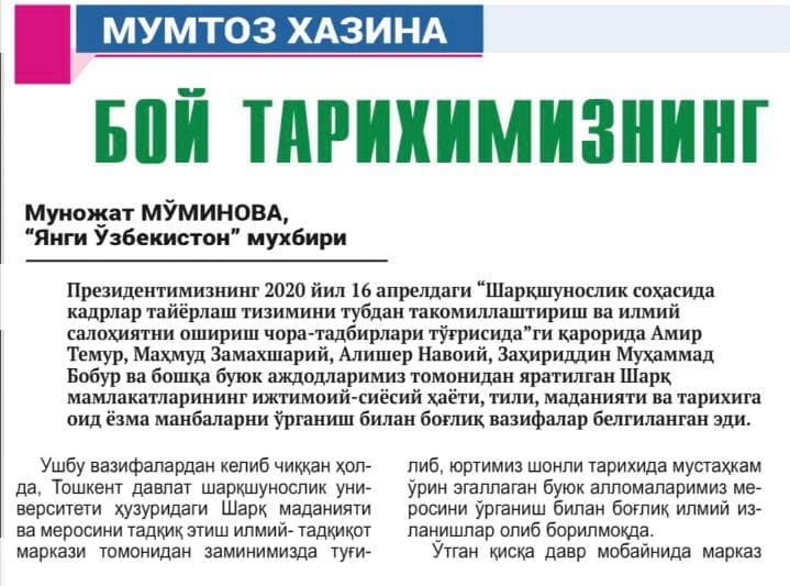 В этой газете вы можете прочитать о некоторых аспектах деятельности Научно-исследовательского центра по изучению восточной культуры и наследия при Ташкентском государственном университете востоковедения.
