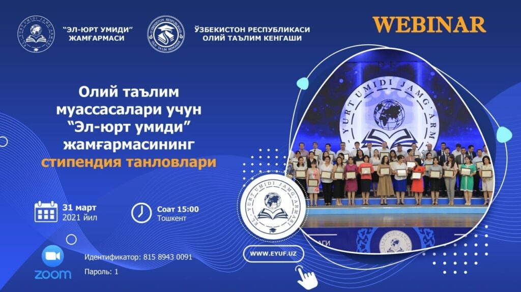 Объявление(Uzbek) Oliy ta’lim muassasalari uchun “El-yurt umidi” jamg‘armasining stipendiya tanlovlari” mavzusida vebinar bo‘lib o‘tadi