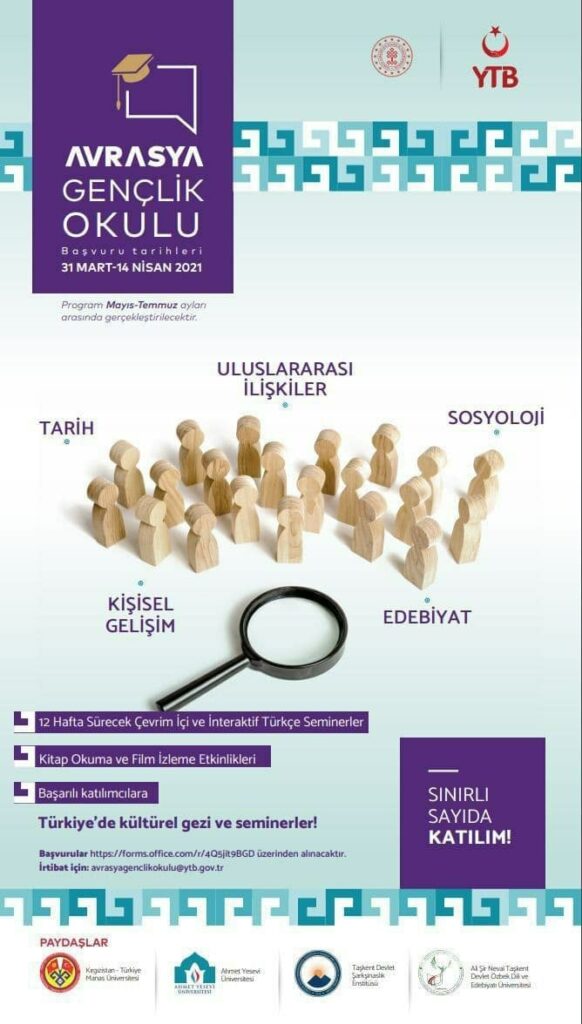 С 31 марта по 14 апреля 2021 года Ташкентского государственного университета востоковедения и Ташкентского государственного университета узбекского языка и литературы имени Алишера Навои примут участие в программе «Молодежная школа Евразии», организованной впервые по инициативе Министерство «Турки за рубежом и родственные общины» Турецкой Республики. Среди более 600 студентов, подавших заявки на языковые курсы, некоторым нашим студентам удалось попасть в топ-30. После 3 месяцев онлайн-занятий программа подошла к концу и в ТГУВ учатся следующие студенты: