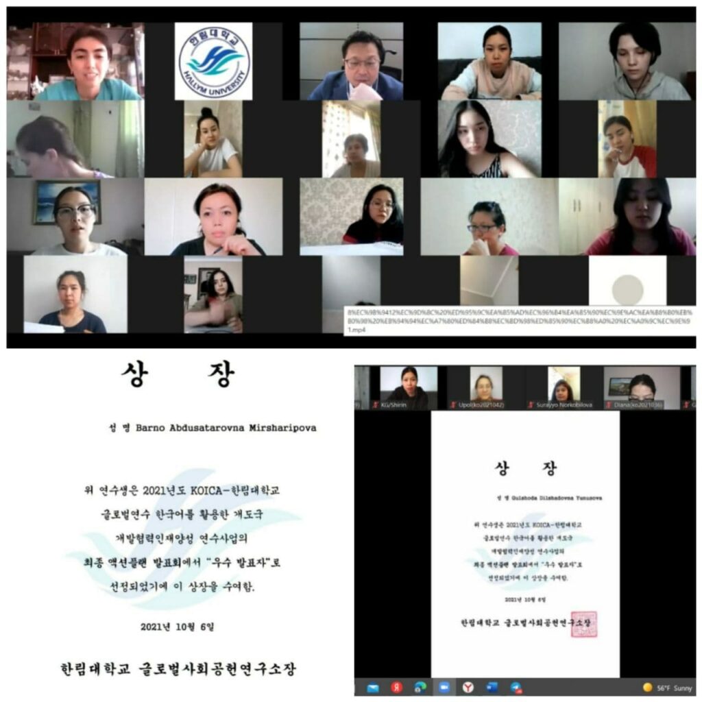В конце учебной программы был организован конкурс творческих работ и проектов среди профессорско-преподавательского состава. Творческие проекты, представленные Миршариповой Б.А. и Юнусовой Г.Д. получили особое признание жюри конкурса. Авторы этих творческих работ были признаны победителями и получили сертификаты международной организации KOICA.