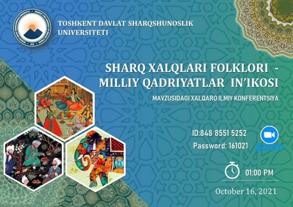 (Uzbek) “Sharq xalqlari folklori — milliy qadriyatlar in’ikosi” mavzuidagi xalqaro ilmiy-amaliy konferensiyaga taklif etamiz