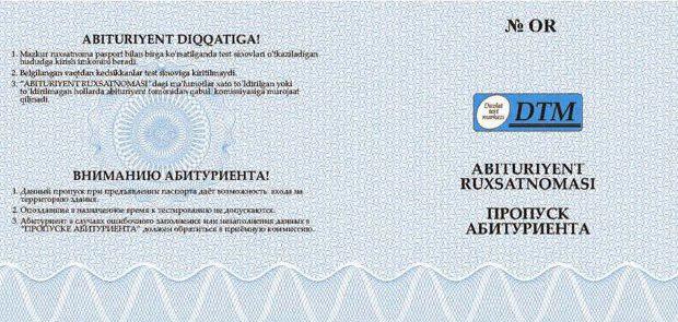 1. Абитуриенты 20-29 июля на официальном сайте ГЦТ (www.dtm.uz) в разделе «Пропуск абитуриента» вводит серию и номер паспорта (или свидетельства о рождении).