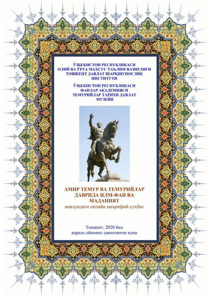 Уважаемые наставники и студенты! Приглашаем Вас принять участие в Научно-просветительской онлайн-беседе «Наука и культура в период правления АмираТемура и династии Темуридов», посвященной 684 годовщине со дня рождения Амира Темура. Беседа состоится восьмого апреля 2020 года в 15:00 в online режиме на платформе Zoom, можете пройти по ссылке https://us04web.zoom.us/j/4810625896. Видеозапись онлайн-беседы будет размещена на канале @sharq_xabar