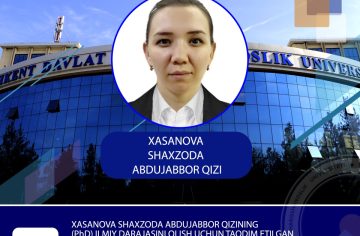 Жумаева Камола Шавкат кизи диссертационная работа подготовленная по специальности 10.00.05 – Языки и литература народов Азии и Африки на тему: « Жанр касыды в творчестве Хакани Ширвани (композиционные особенности, мотивы, художественность)» для получения ученой степени доктора философии (PhD) по филологическим наукам. Защита состоится: 20 сентября 2025 года, в 9:00 часов....