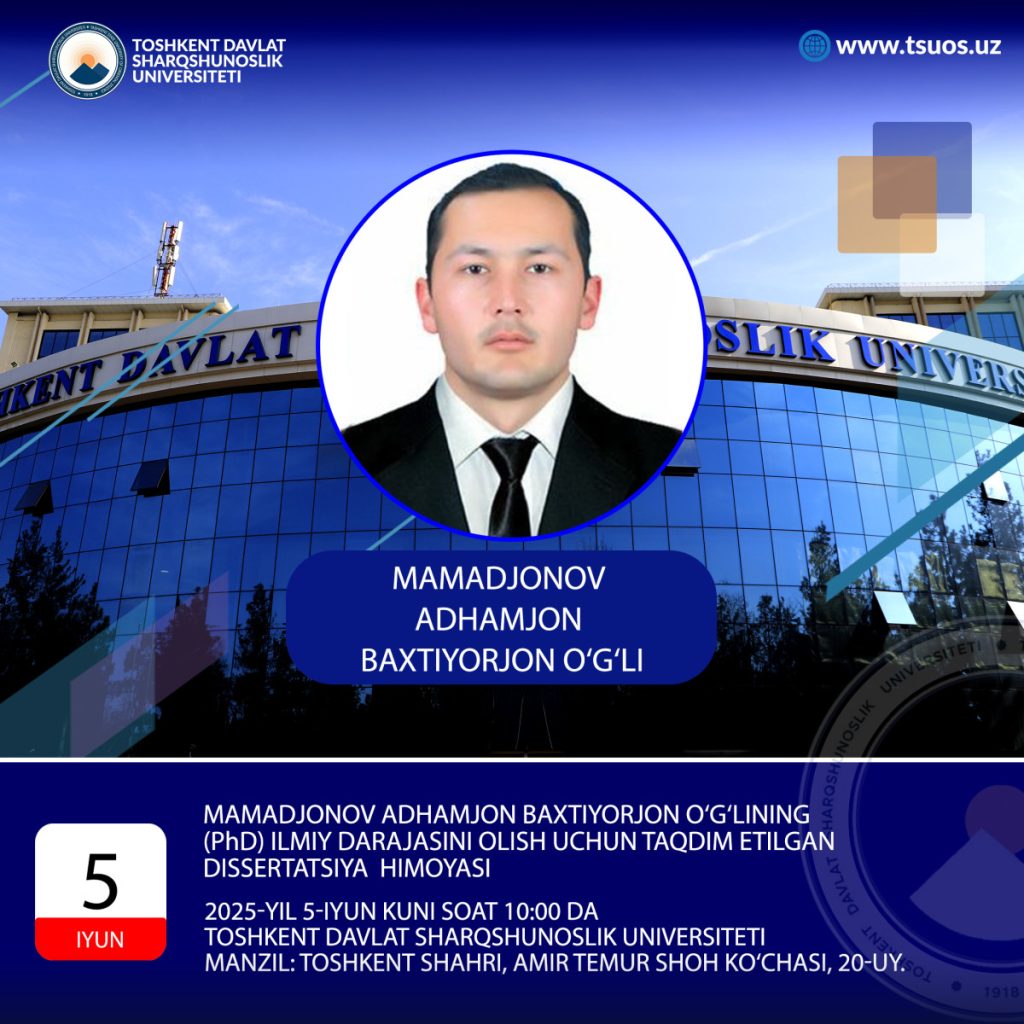 Защита диссертации Мамаджонова Адхамжона Бахтияржоновича на тему «Фактор “мягкой силы” во внешней политике Турции в Центральной Азии» представленная на соискание учёной степени доктора философии (PhD) по политическим наукам по специальности 23.00.04 – «Международные отношения, политические проблемы глобального и регионального развития» состоится на заседании Научного совета DSc.03/29.12.2022.Ss.21.02 при Ташкентском государственном университете востоковедения в 10:00 часов 5 июня 2025 года.