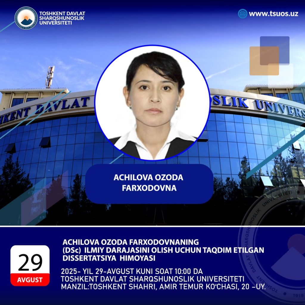 Ачилова Озода Фарходовна, диссертационная работа подготовленная по специальности 10.00.06–Сравнительное литературоведение, сопоставительное языкознание и переводоведение на тему: «Прагма-дискурсивные особенности японских и узбекских императивных пословиц» для получения ученой степени доктора филологических наук (DSc). Защита состоится: 29 августа 2025 г., 10:00.