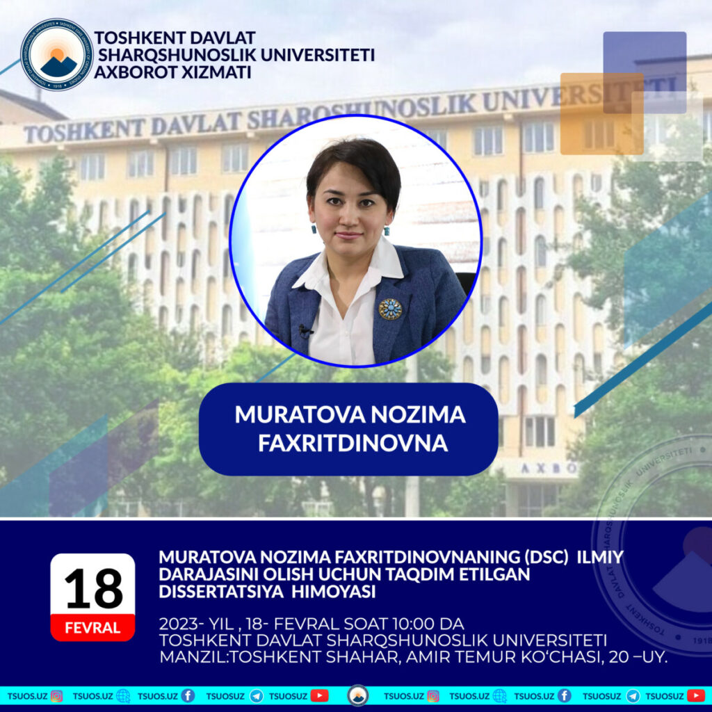 Муратова Нозима Фахритдиновна, диссертационная работа подготовленная по специальности 10.00.09 – Журналистика на тему: «мультимедийная журналистика: международный и национальный опыт» для получения ученой степени доктора филологических наук (DSc). Защита состоится: 18 февраля 2023 года, в 10:00.