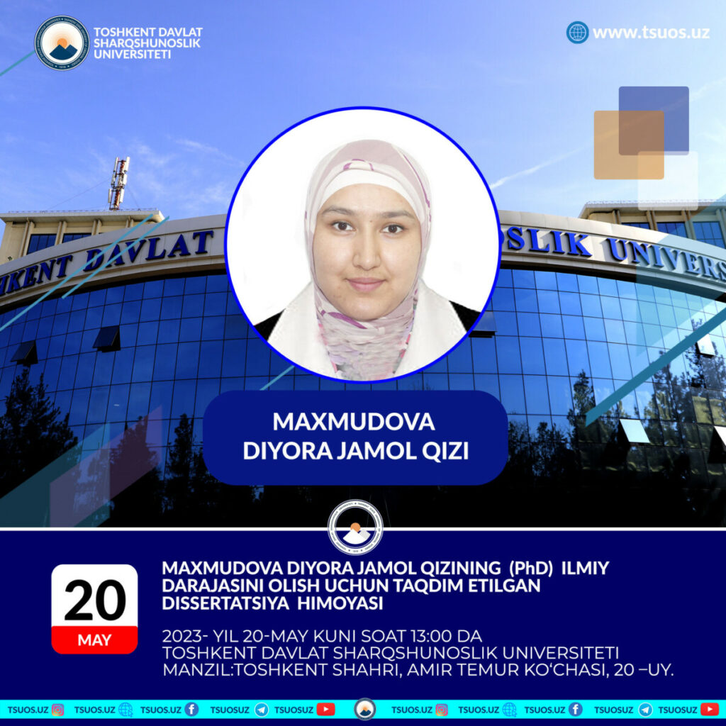 Махмудова Диёра Жамол кизи, диссертационная работа подготовленная по специальности 10.00.05 – Язык и литература народов Азии и Африки на тему: “Словообразование по морфологическому способу в арабском языке” на соискание ученой степени доктора философии (PhD) по филологическим наукам . Защита состоится: 20 мая 2023 года в 13:00 часов.