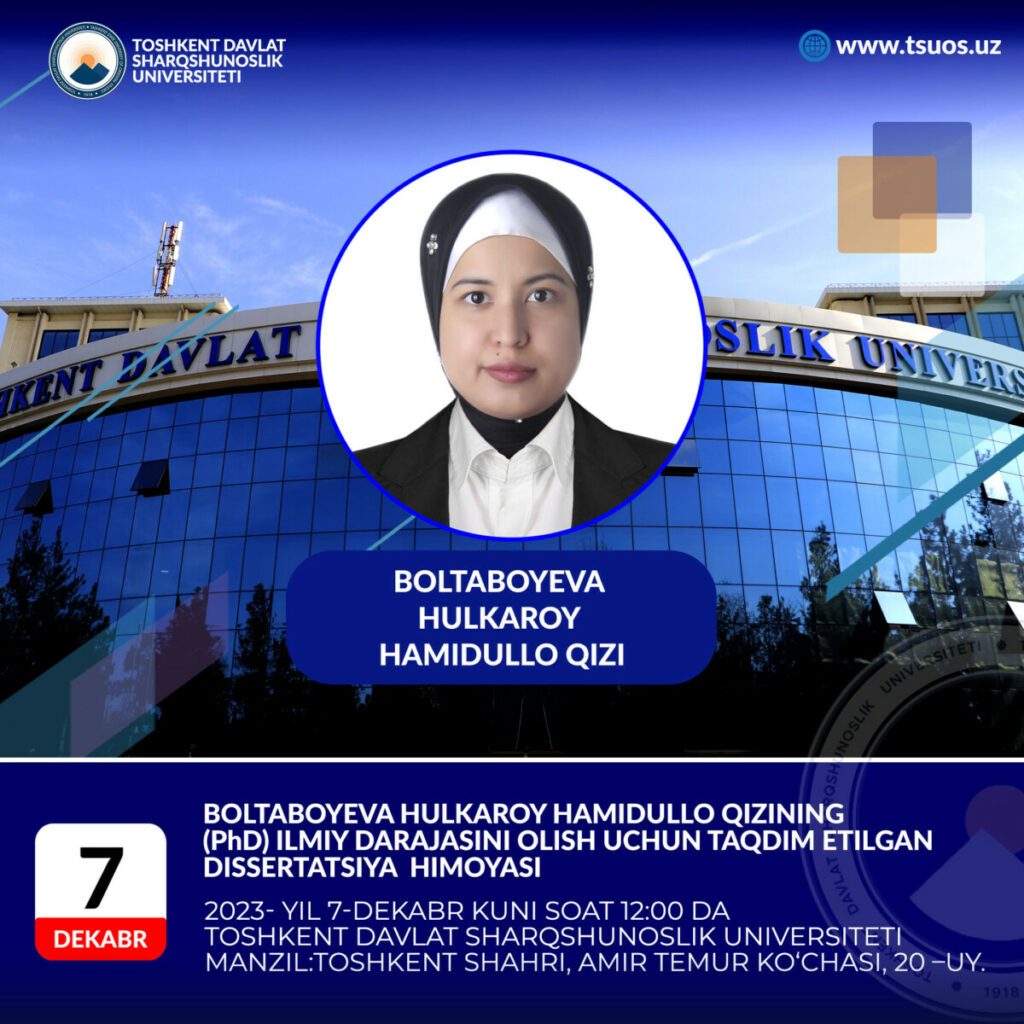 Болтабоева Xулкарой Xамидулло кизи, диссертационная работа подготовленная по специальности 10.00.06 – Сравнительное литературоведение, сопоставиительное языкознание и переводоведение на тему: «Художественная интерпретaция просветительских идей в творчестве Мехмета Акифа Эрсоя и Фитрата» для получения ученой степени доктора философии (PhD) по филологическим наукам. Защита состоится: 7 декабря 2023 года, в 12:00.