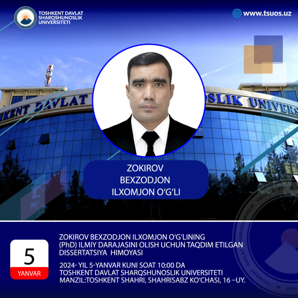 Зокиров Бехзоджон Илхомжон угли, диссертационная работа подготовленная по специальности 07.00.08 – Историография, источниковедение и методы исторических исследований на тему: «Этнотопонимы Средней Азии в произведениях “Путеводителях” русских и иностранных путешественников XIX века» для получения ученой степени доктора философии (PhD) по историческим наукам. Защита состоится: 5 января 2024 года, в 10:00.