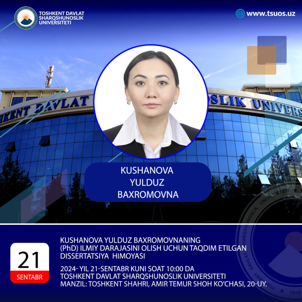 Защита диссертации Кушановой Юлдуз Бахромовны на тему «Сотрудничество Центральной Азии и Франции в области образования, науки и культуры (1991-2022 гг.)» представленная на соискание ученой степени доктора философии по истории(PhD) по специальности история Международных отношений и внешней политики — 07.00.05 состоится на заседании Ученого совета под номером DSc.03/31.01.2024.Tar.21.03 при Ташкентском государственном университете востоковедения в 10:00 часов 21 сентября 2024 года.