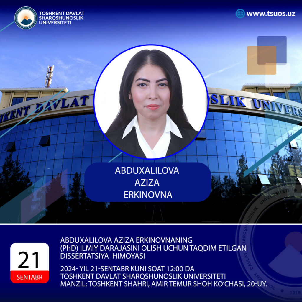 Защита диссертации Абдухалилова Азиза Эркиновны на тему «История и историография налоговой системы Хивинского ханства» представленная на соискание ученой степени доктора философии по истории (PhD) по специальности история Историография, источниковедение и методы исторических исследований — 07.00.08 состоится на заседании Ученого совета под номером DSc.03/31.01.2024.Tar.21.03 при Ташкентском государственном университете востоковедения в 12:00 часов 21 сентября 2024 года.