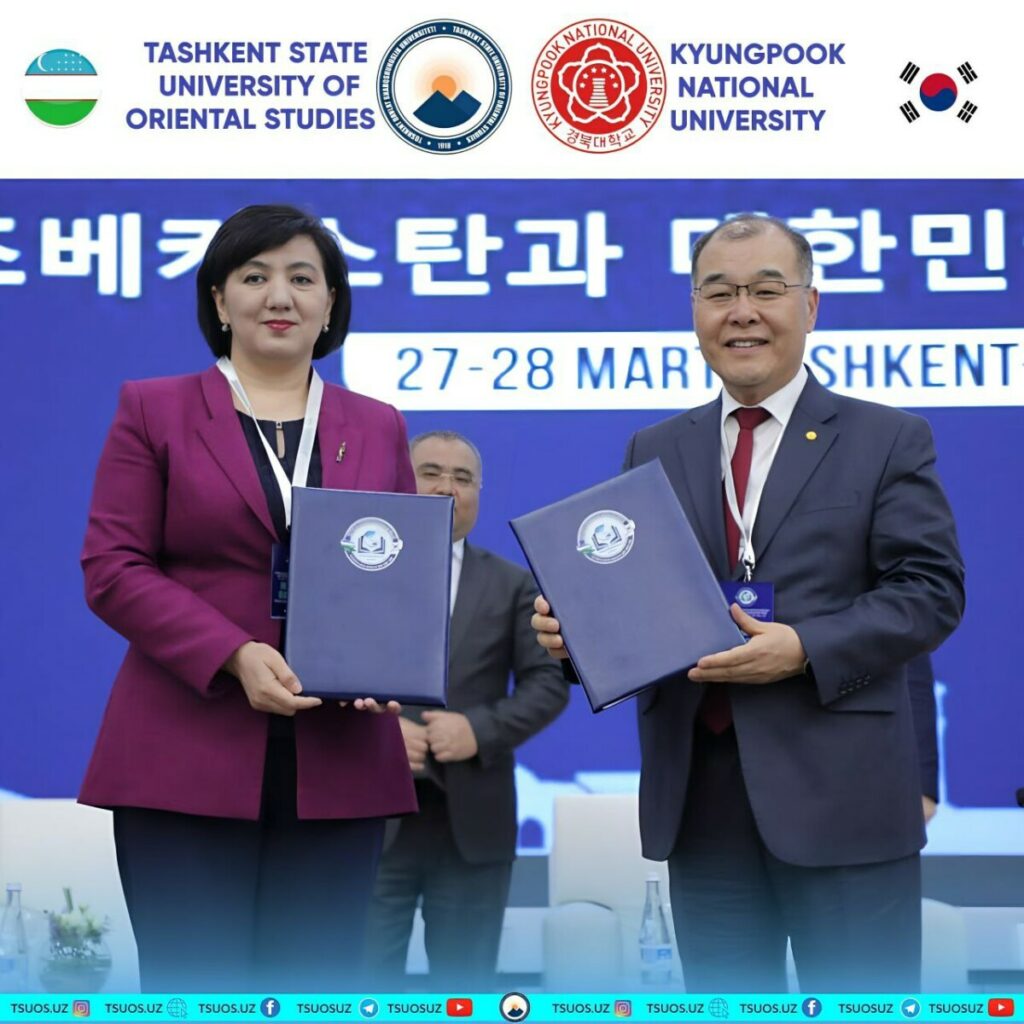 В рамках Узбекско-корейского форума ректоров высших учебных заведений подписан двусторонний меморандум о взаимопонимании между Ташкентским государственным университетом востоковедения и Национальным университетом Кёнпук (Корея).