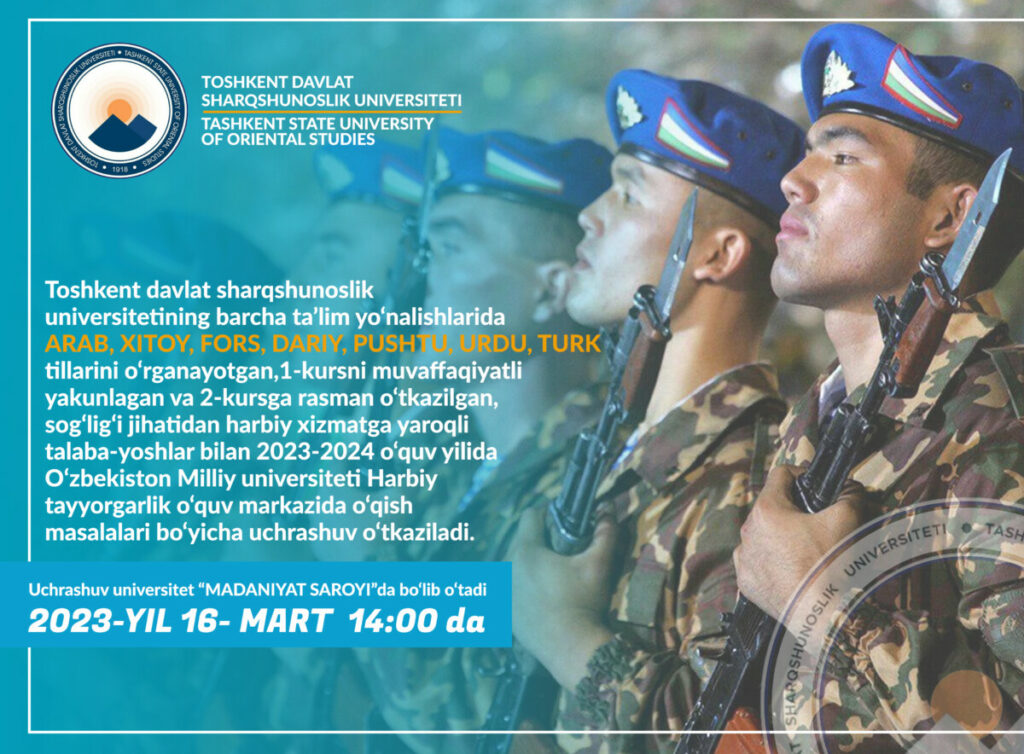 Объявление(Uzbek) Harbiy tayyorgarlik o‘quv markazida o‘qish masalalari bo‘yicha uchrashuv o‘tkaziladi