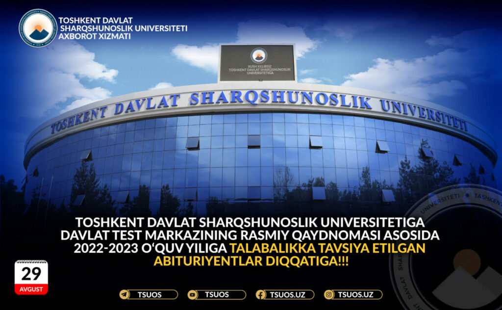 АБИТУРИЕНТОВ, РЕКОМЕНДОВАННЫХ ПО ОФИЦИАЛЬНЫМ ВЕДОМОСТЯМ ГОСУДАРСТВЕННОГО ТЕСТОВОГО ЦЕНТРА НА ОБУЧЕНИЕ В 2022-2023 УЧЕБНОМ ГОДУ ПО ГОСУДАРСТВЕННЫМ ГРАНТАМ И НА ПЛАТНО-КОНТРАКТНОЙ ОСНОВЕ В ТАШКЕНТСКОМ ГОСУДАРСТВЕННОМ УНИВЕРСИТЕТЕ ВОСТОКОВЕДЕНИЯ ПРОСИМ ЛИЧНО СДАТЬ В РАБОЧИЕ ГРУППЫ СЛЕДУЮЩИЕ ДОКУМЕНТЫ С 5 СЕНТЯБРЯ ПО 10 СЕНТЯБРЯ 2022 ГОДА ВКЛЮЧИТЕЛЬНО: