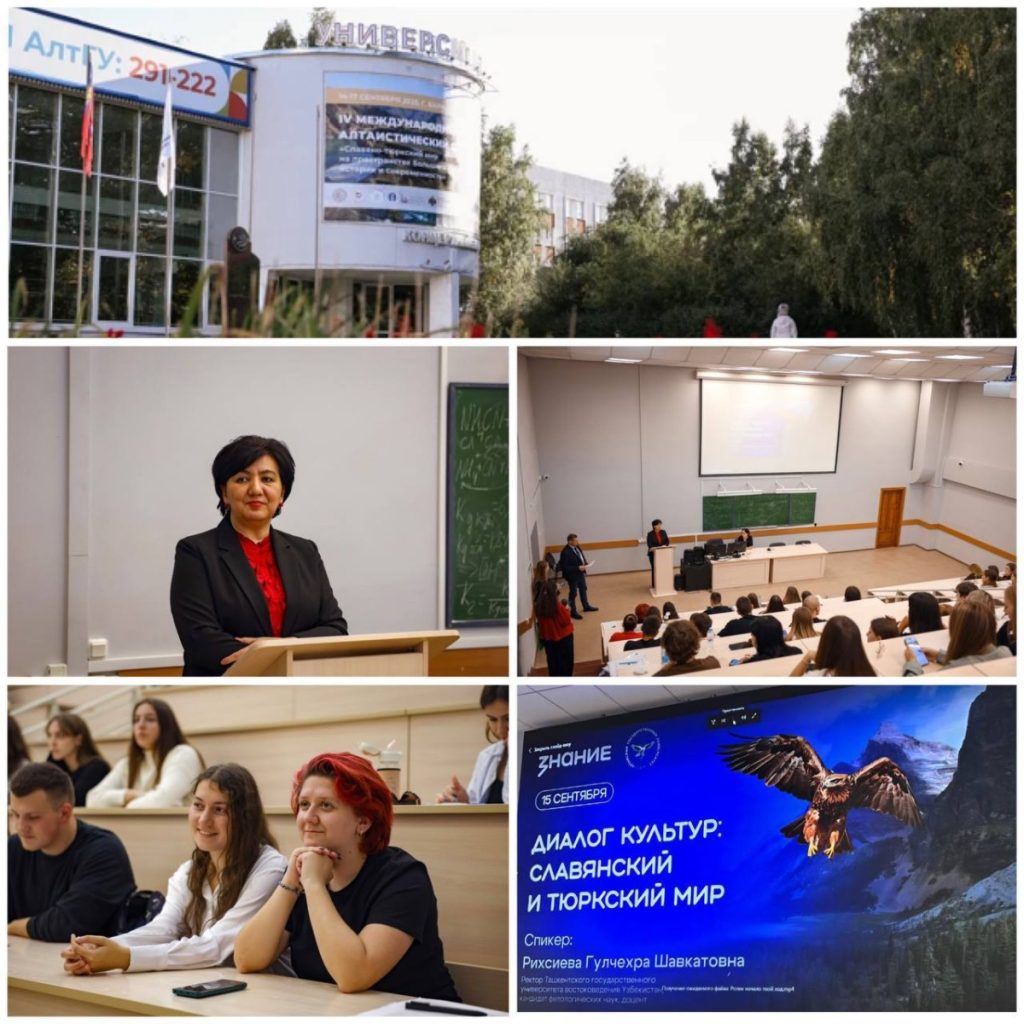 В рамках «IV Международного Алтайского форума», проходящего в городе Барнаул Алтайского края Российской Федерации, ректор ТГВУ Гулчехра Рихсиева прочитала лекцию для студентов Алтайского государственного университета о достижениях ТГВУ в сфере науки и образования, а также о процессах международного сотрудничества. Кроме того, она пригласила студентов обучаться в ТГВУ, проходить практику и участвовать в летних школах.