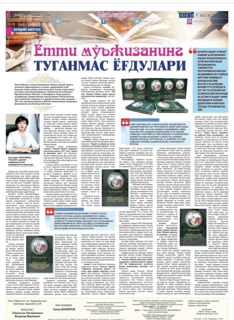 Представляем вашему вниманию статью ректора ТГУВ Рихсиевой Гульчехры Шавкатовны «Неиссякаемые лучи семи чудес» опубликованную в 7-номере газеты «Новый Узбекистан» от 12.01.2022.