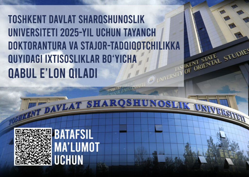 (Uzbek) TOSHKENT DAVLAT SHARQSHUNOSLIK UNIVERSITETI 2025-yil uchun tayanch doktorantura va stajor-tadqiqotchilikka quyidagi ixtisosliklar bo‘yicha qabul e’lon qiladi
