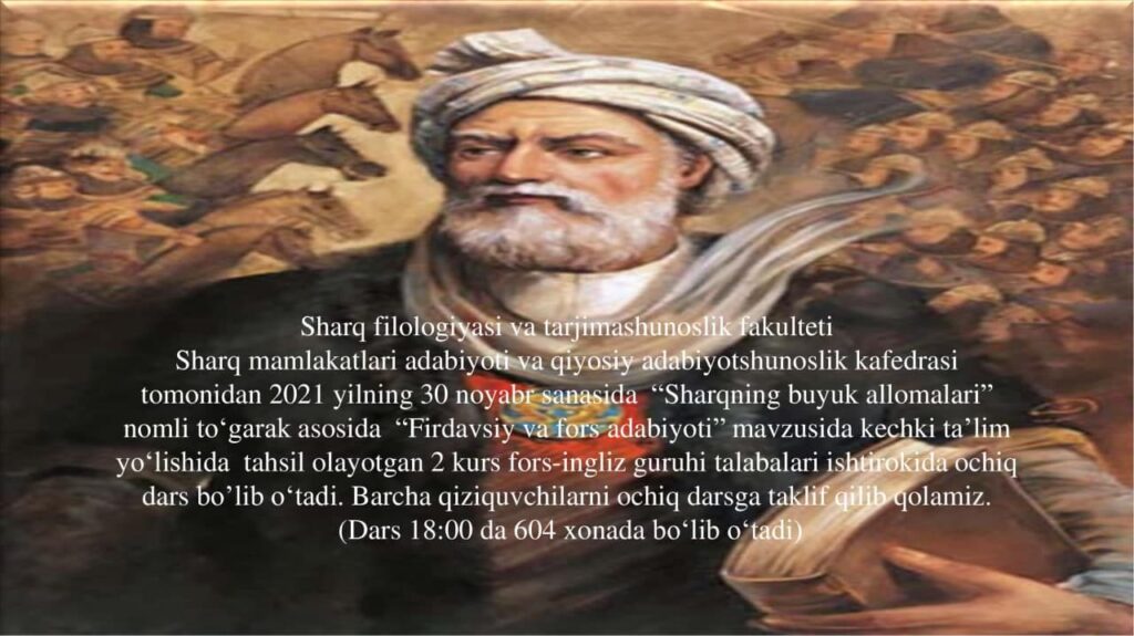 2021-yil 30-noyabr soat 18:00 da TDSHU Sharq mamlakatlari adabiyoti va qiyosiy adabiyotshunoslik kafedrasining «Sharqning buyuk allomalari» to‘garagi rejasi asosida, kafedra o‘qituvchisi Dinora Yusupova tomonidan kechki ta’lim yo‘nalishida tahsil olayotgan 2-bosqich fors-ingliz guruhi talabalari ishtirokida «Firdavsiy va fors adabiyoti» mavzusi doirasida tadbir va ochiq dars bo‘lib o‘tadi.