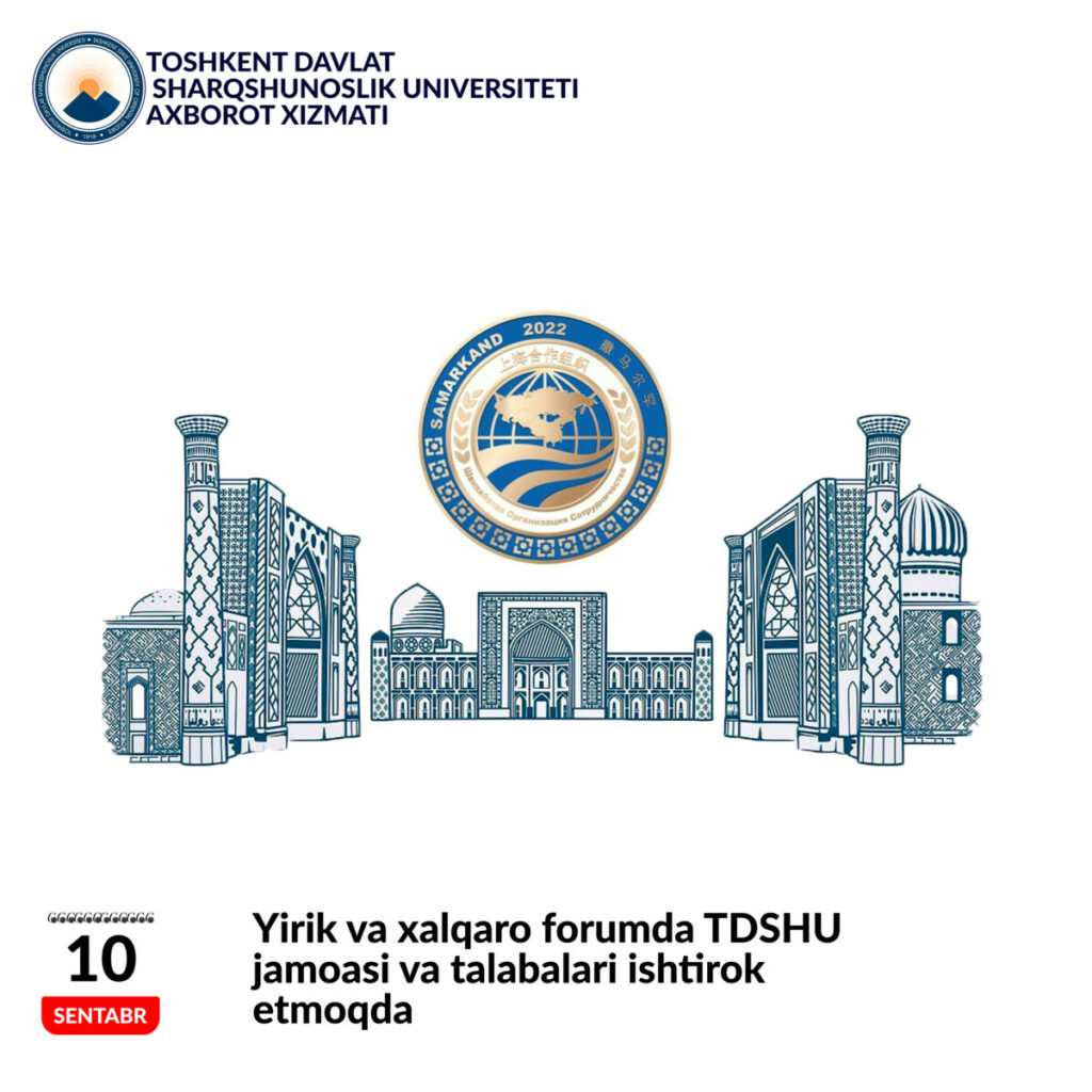 Xabaringiz bor 15-16-sentabr kunlari Samarqand ShHT davlat rahbarlarining navbatdagi sammitiga mezbonlik qiladi. Kelgusi haftada o’tkaziladigan yilning eng yirik siyosiy va diplomatik forumi oldidan O’zbekistonning ko’plab oliy muassasalari qatori Toshkent davlat sharqshunoslik universitetidan ham 18 nafar professor o’qituvchi va talabalari volontyor-tarjimon sifatida nufuzli forumga jalb qilingan.