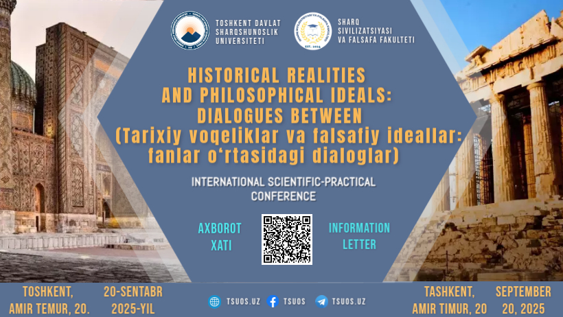 O‘zbekiston Respublikasi Prezidentining 2020-yil 17-apreldagi “Sharqshunoslik sohasida kadrlar tayyorlash tizimini tubdan takomillashtirish va ilmiy salohiyatni oshirish chora-tadbirlari toʻgʻrisida”gi PQ-4680-sonli qarori va 2020 yil 29 oktyabrdagi “Ilm-fanni 2030 yilgacha rivojlantirish konsepsiyasini tasdiqlash toʻgʻrisida” PF-6097-son farmoni ijrosini ta’minlash maqsadida “Sharq sivilizatsiyasi va falsafa” fakulteti tomonidan 2025-yil 20-sentyabr kuni “Tarixiy voqeliklar va falsafiy ideallar: fanlar o‘rtasidagi dialoglar” mavzusida xalqaro ilmiy-amaliy konferensiyasi tashkil qilinmoqda.