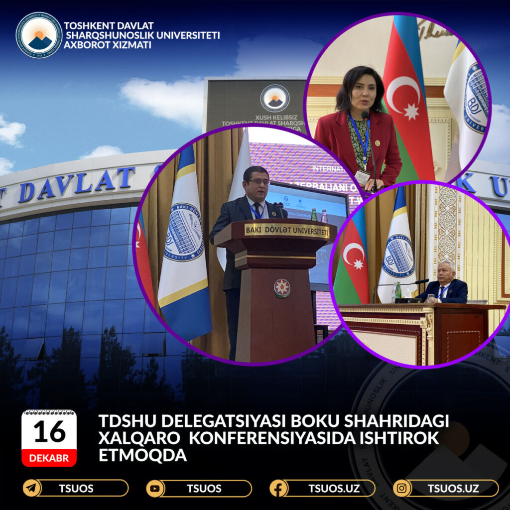 2022-yilning 14-15-dekabr kunlari Boku davlat universitetida Sharqshunoslik fakultetining 100 yilligiga bag‘ishlangan “Ozarbayjon sharqshunosligi ilmiy-madaniy va ijtimoiy-siyosiy Sharq-G‘arb muloqoti kontekstida” xalqaro konferensiyasi bo‘lib o‘tdi. Konferensiya BDU tomonidan Ozarbayjon Turk madaniyati va merosi xalqaro jamg‘armasi ko‘magida tashkil etildi. Konferensiya ochilishi oldidan BDU rektori Elchin Babayev xorijiy tashkilotlar va universitetlardan taklif etilgan konferensiya ishtirokchilari bilan uchrashuv o‘tkazdi,unda ilmiy tadqiqot va ta’lim dasturlarining turli yo‘nalishlari, jumladan, ikki va uchlik diplom dasturlari bo‘yicha hamkorlikni yanada rivojlantirish istiqbollari muhokama qilindi. Uchrashuvda Toshkent davlat sharqshunoslik universiteti delegatsiyasi faol ishtirok etdi. Universitet prorektori A.Vohidov, arab filologiyasi kafedrasi mudiri Sh.Shamusarov, xitoy filologiyasi kafedrasi mudiri S.Nazarova yig‘ilganlarni universitetning yo‘nalish va mutaxassisliklari, ayniqsa turk filologiyasi yo‘nalishida  ozarbayjon tilini oʻrganish joriy oʻquv yilining ikkinchi semestridan boshlanishi va  istiqbolda qoʻshma ilmiy tadqiqotlar va qoʻshma taʼlim dasturlari, talabalar va oʻqituvchilar almashinuvi, talabalar uchun yozgi maktablar tashkil etish mumkinlgi takidlab o`tildi. BDU rahbariyati bunday hamkorlikka qiziqish va Toshkentda ozarbayjon tilini o‘rganishni qo‘llab-quvvatlashga tayyorligini bildirdi. Ushbu uchrashuvdan so’ng,  konferensiya ochilishida faxriy mehmonlar, xorijiy delegatsiyalar rahbarlari, jumladan, TDSHU  o’quv ishlari bo’yicha prorektori A.A. Vohidov, rektor G. Rixsiyevaning tabrik so‘zini o‘qib eshittirdi. Tabrik so‘zi ishtirokchilarda, ayniqsa, BDU va barcha sharqshunoslik markazlari bilan hamkorlik istiqbollari alohida ta’kidlangani katta qiziqish uyg‘otdi. Konferensiyaning birinchi kuni yalpi majlisda professor Sh.Shamusarov “Movaroannahrda arab tilini o‘qitish”, dotsent S.A.Nazarova “Talabalarning chet tillari madaniyatlararo muloqotini o‘rgatishning zamonaviy yondashuvlari sharhi ( xitoy tili misolida) mavzularida ma’ruza qildilar. “Uzoq Sharq tilshunosligi” bo‘limida Dana Kamilla “Xitoy madaniyatida yo‘lbars obrazining ramziyligi” mavzusida taqdimot qildi.