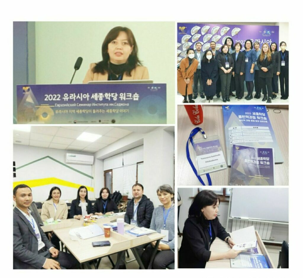 2022-yilning 8-10-noyabr kunlari Janubiy Koreya Respublikasining «Qirol Sejong» instituti tomonidan tashkil qilingan “Yevroosiyo” seminari (Workshop)da Toshkent davlat sharqshunoslik universiteti Koreys filologiyasi kafedrasi dotsenti v.b., PhD. Gulshoda Yunusova ham ishtirok etdi. Seminar jarayonida koreys tilini o‘zbek tilida o‘rganuvchilar uchun ishlab chiqilayotgan “og‘zaki va yozma tarjima”, “bizness tarjima”ga oid darsliklarning  ahamiyat qaratish lozim bo‘lgan jihatlari muhokama qilindi. Seminarda Qirg‘iziston, Qozog‘iston, Tojikiston, Rossiyadan ham mutaxasislar ishtirok etishdi. Workshop qizg‘in muzokara-munoza-mulohaza shaklida bo‘lib o’tdi. Tez kunlarda o‘zbek talabalari uchun darsliklarning ilk nashrlari chiqishi kutilmoqda.