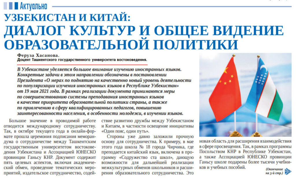 TDSHU dotsenti, YUNESKO tashkilotining Xitoy Xalq Respublikasi Gansu provinsiyasi assotsiatsiyasining Oʻzbekistondagi ta’lim masalalari boʻyicha maslahatchi Hasanova Feruza Mirzabekovnaning maqolasi «ПРАВДА ВОСТОК» gazetasida chop etildi.