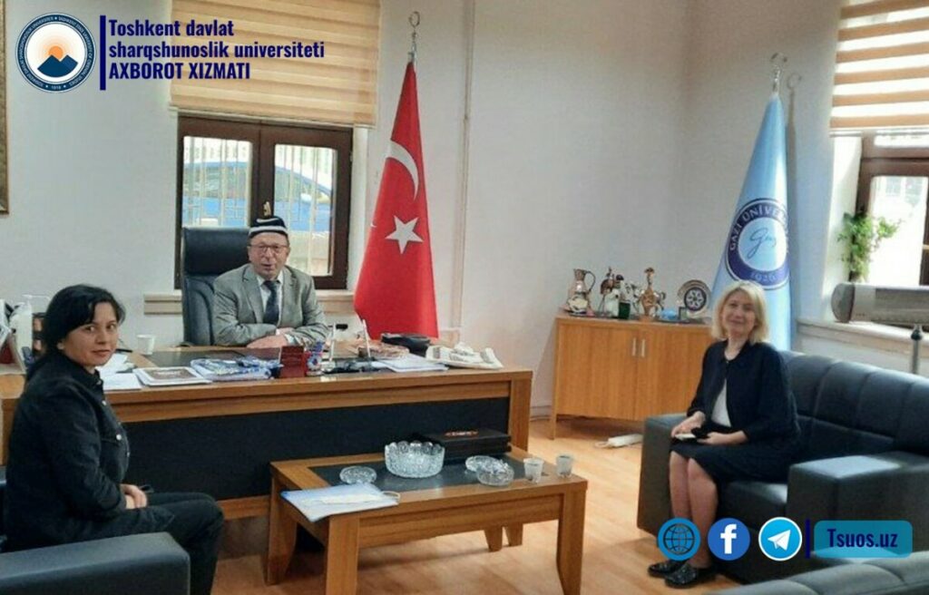 Toshkent davlat sharqshunoslik universiteti «Turk filologiyasi» kafedrasi mudiri f.f.d., dots. P.Kenjayeva 2022-yilning 17 may kuni Turkiyaning G’ozi universitetiga tashrifi chog’ida «Turk tili va ijtimoiy fanlar metodikasi» kafedrasi mudiri f.f.d., prof. F.Achik bilan uchrashib kafedraning istiqbolli rejalari haqida, xususan kafedra prof-o’qituvchilarining 1 oylik malaka oshirish kurslari, hamkorlikdagi ilmiy-uslubiy ishlar, onlayn darslarning davomiyligi borasida kelishib olindi. G’ozi universiteti bakalavr bosqichidan keyingi ta’lim rahbari (Enstitü müdürü) prof.Yu.Gelishli bilan ham uchrashib iyun oyida turkiy xalqlar adabiyoti masalalariga bag’ishlangan onlayn seminar o’tkazish rejalashtirildi.Universitetning magistrlariga «O’zbekistonda turk tilining o’rganilishi» mavzusida turk tilida ma’ruza qilindi.