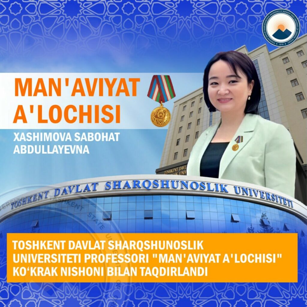 Toshkent davlat sharqshunoslik universiteti professori, filologiya fanlari doktori, xitoyshunos olima Xashimova Sabohat Abdullayevna O‘zbekiston Respublikasi Milliy gvardiyasi qo‘mondonining 2024-yil 31-avgustdagi 228-sonli buyrug‘iga asosan «Man’aviyat a’lochisi»  ko‘krak nishoni bilan taqdirlandi.