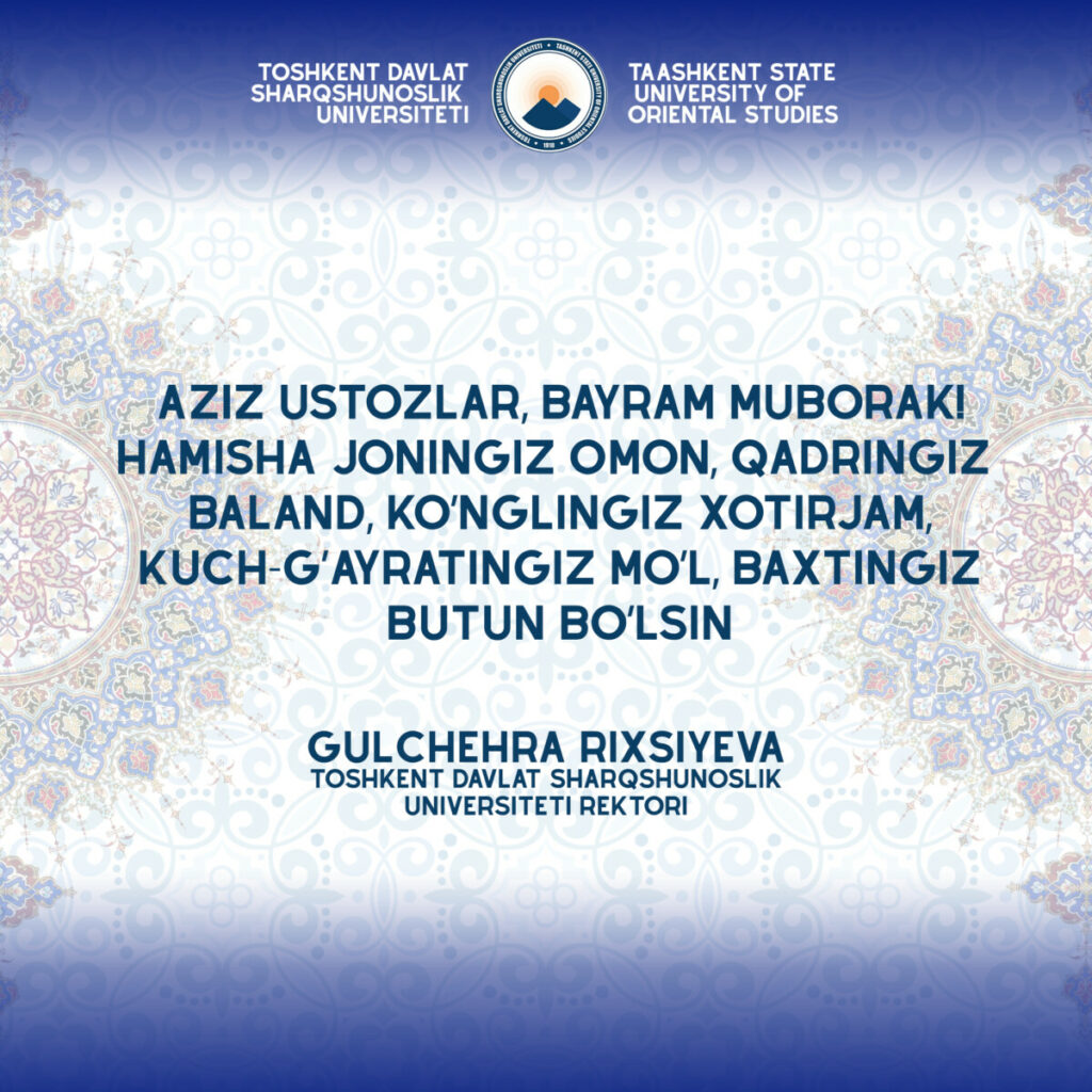 TDSHU rektori Rixsiyeva Gulchehra Shavkatovnaning jamoaga va soha xodimlariga yo’llagan bayram tabrigi