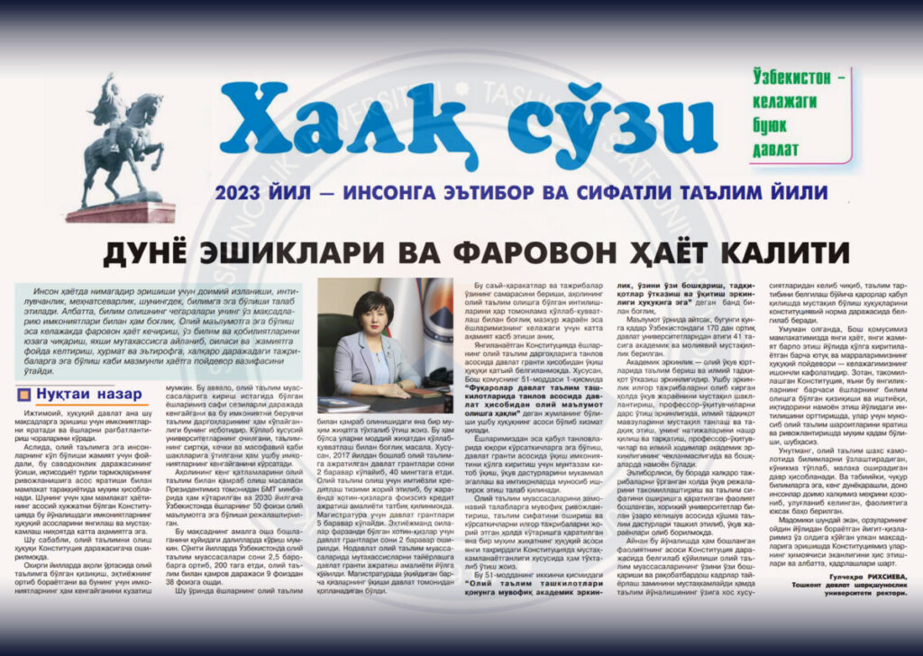 Toshkent davlat sharqshunoslik universiteti rektorining «Xalq so’zi» gazetasida «Dunyo eshiklari va farovon hayot kaliti» nomli maqolasi chop etildi.